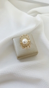 Anel com aramado vazado e liso, zircônias brancas e uma pérola shell.