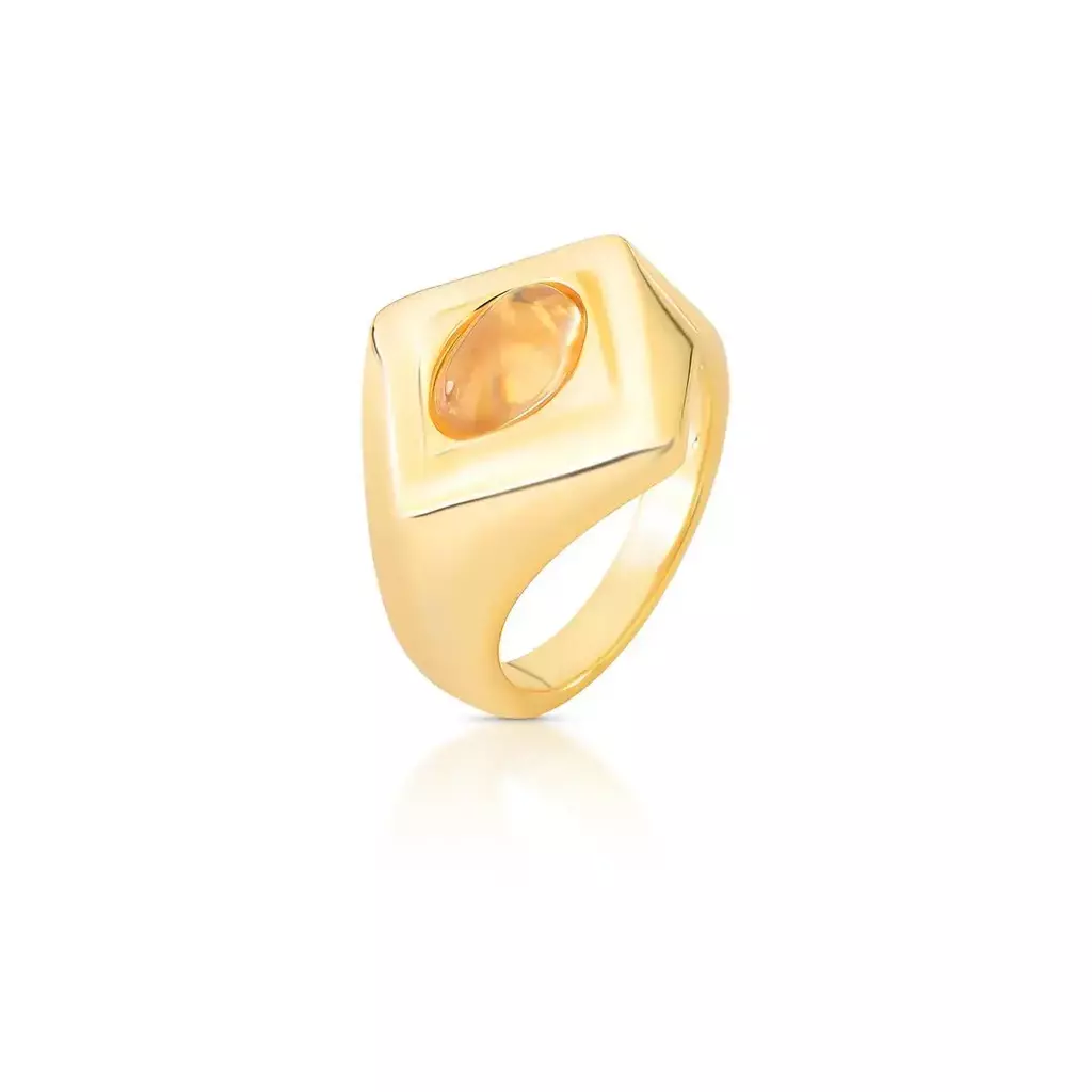 Anel banhado a ouro com design curvo e losango trabalhado, destacado por pedra rutilo reconstituída. Peça sofisticada que agrega estilo e elegância para complementar seu visual com exclusividade.