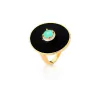 Anel oval, esmaltado na cor preta e cristal ametista redondo e zirconias redondas na cor branca banhado a ouro.
