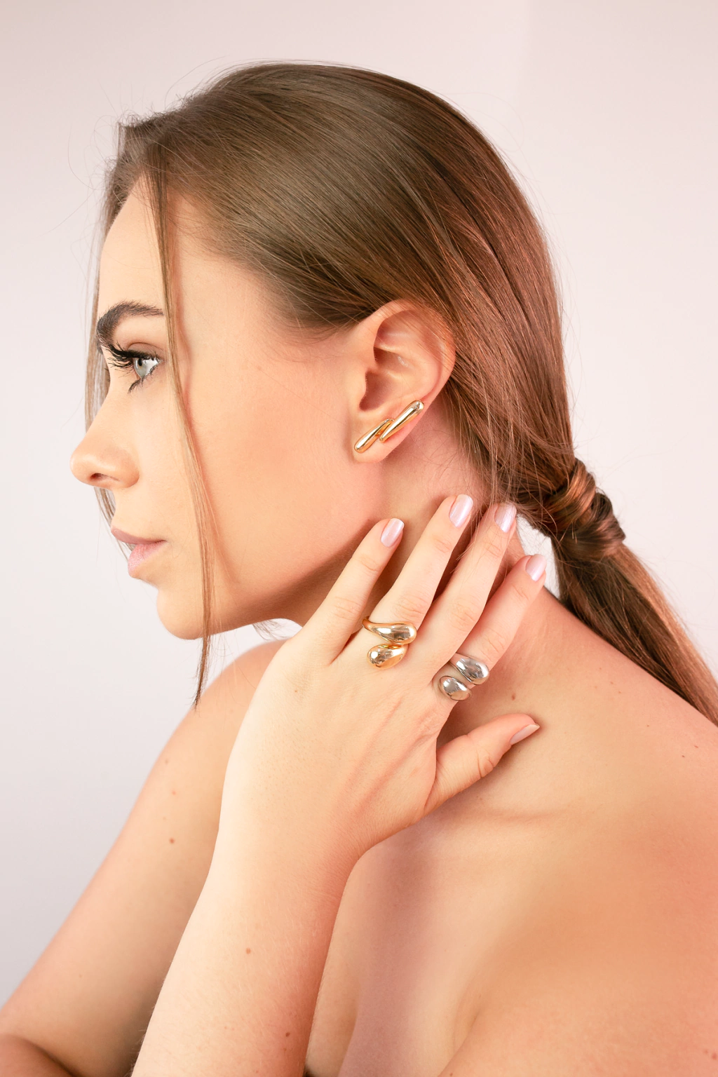 Anel regulável aberto gotas abauladas banhado a ródio.