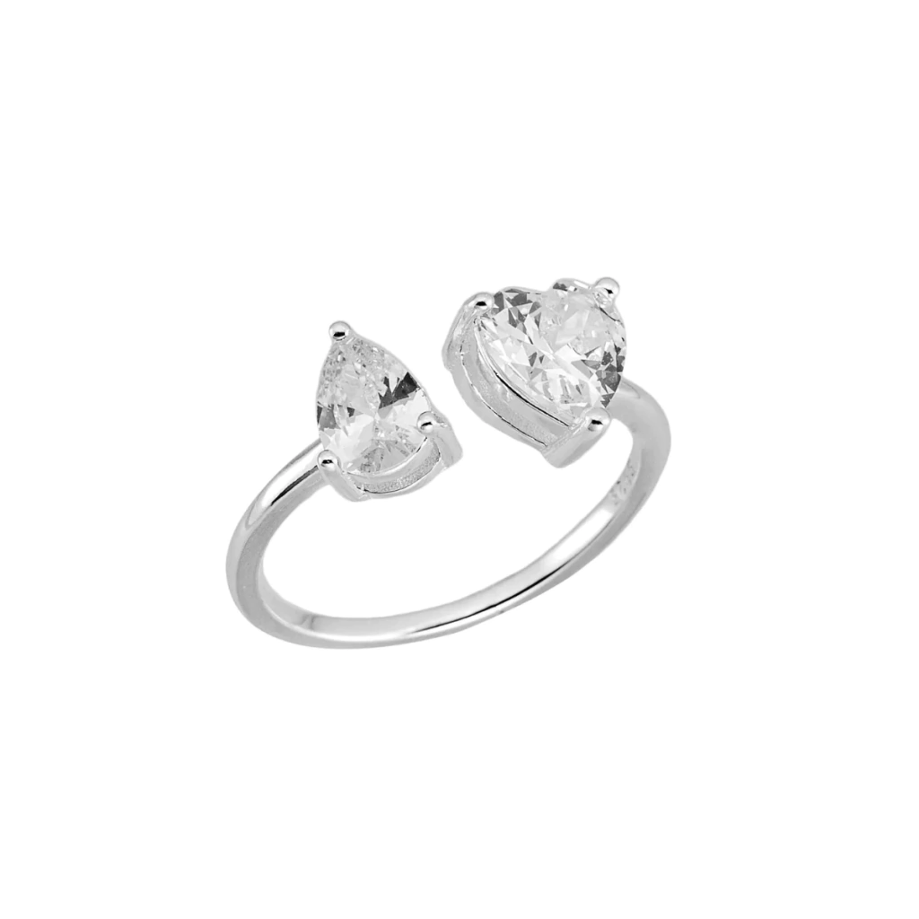 Anel regulável zircônia branca coração e gota prata 925 lisa.