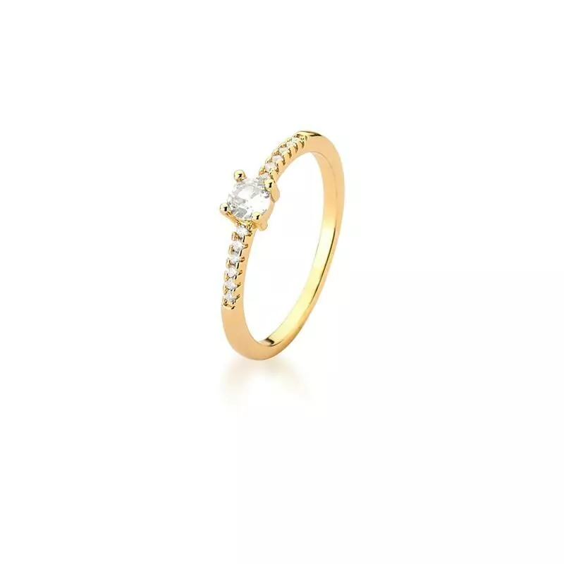Anel solitário com cristal redondo e zircônias, ambos brancos.