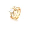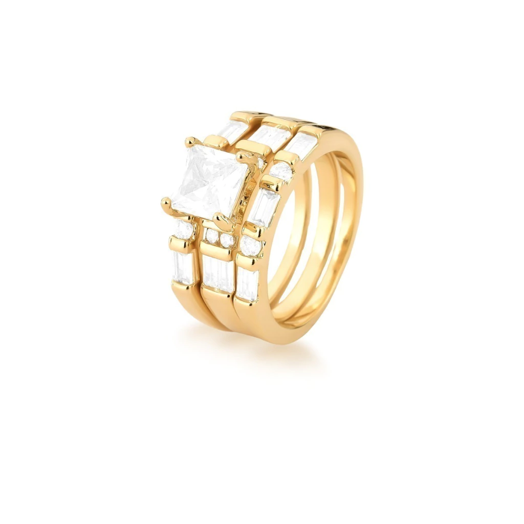 Anel triplo com solitário e zircônias baguete banhado a ouro