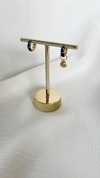 Argola kids lisa na cor azul iridescente assimétrica com pingente de concha lisa e fecho de click banhada a ouro.