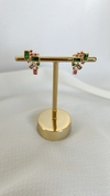 Brinco botão com pedras retangulares coloridas, zircônias rosas, verdes e roxas banhado a ouro.