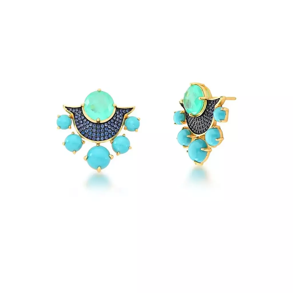 Brinco com cristal turmalina e cabochão turquesa banhado a ouro