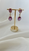 Brinco pêndulo com cristais ovais na cor ametista e cravejado de zircônias na cor branca banhado a ouro.