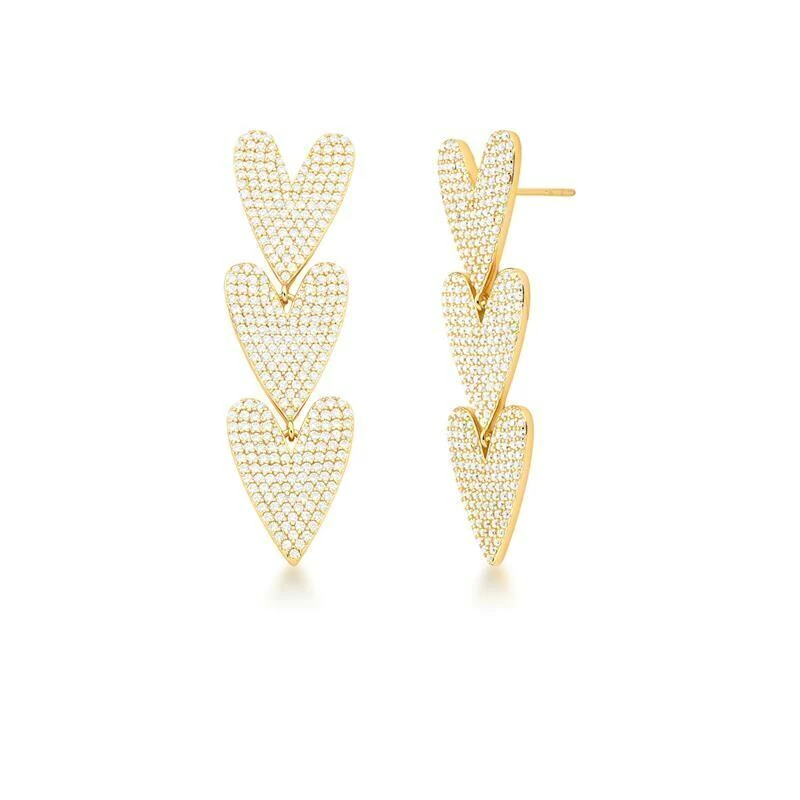 Brinco pêndulo de corações cravejados de zircônias na cor branca banhado a ouro. Peças com o tema de coração, são clássicas que nunca saem de moda, transmitindo muito sentimento e emoção, o coração é uma peça atemporal aposte nelas sem medo de errar!