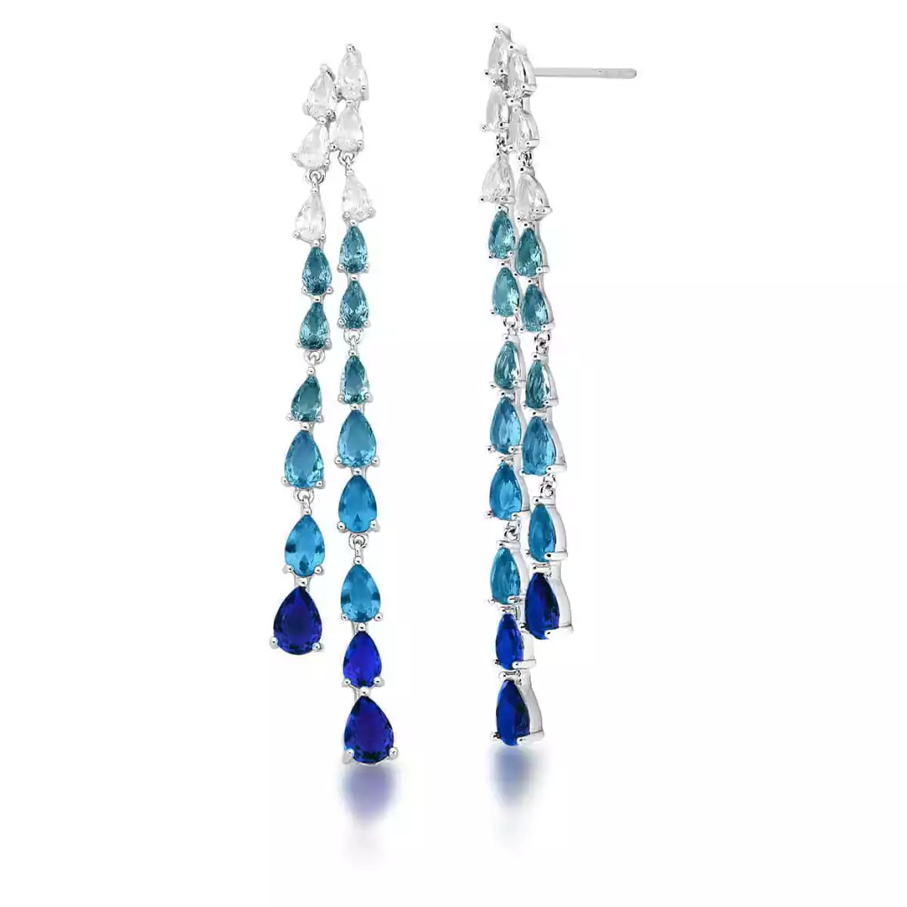 Brinco pêndulo zircônias azuis e brancas banhado a ródio
