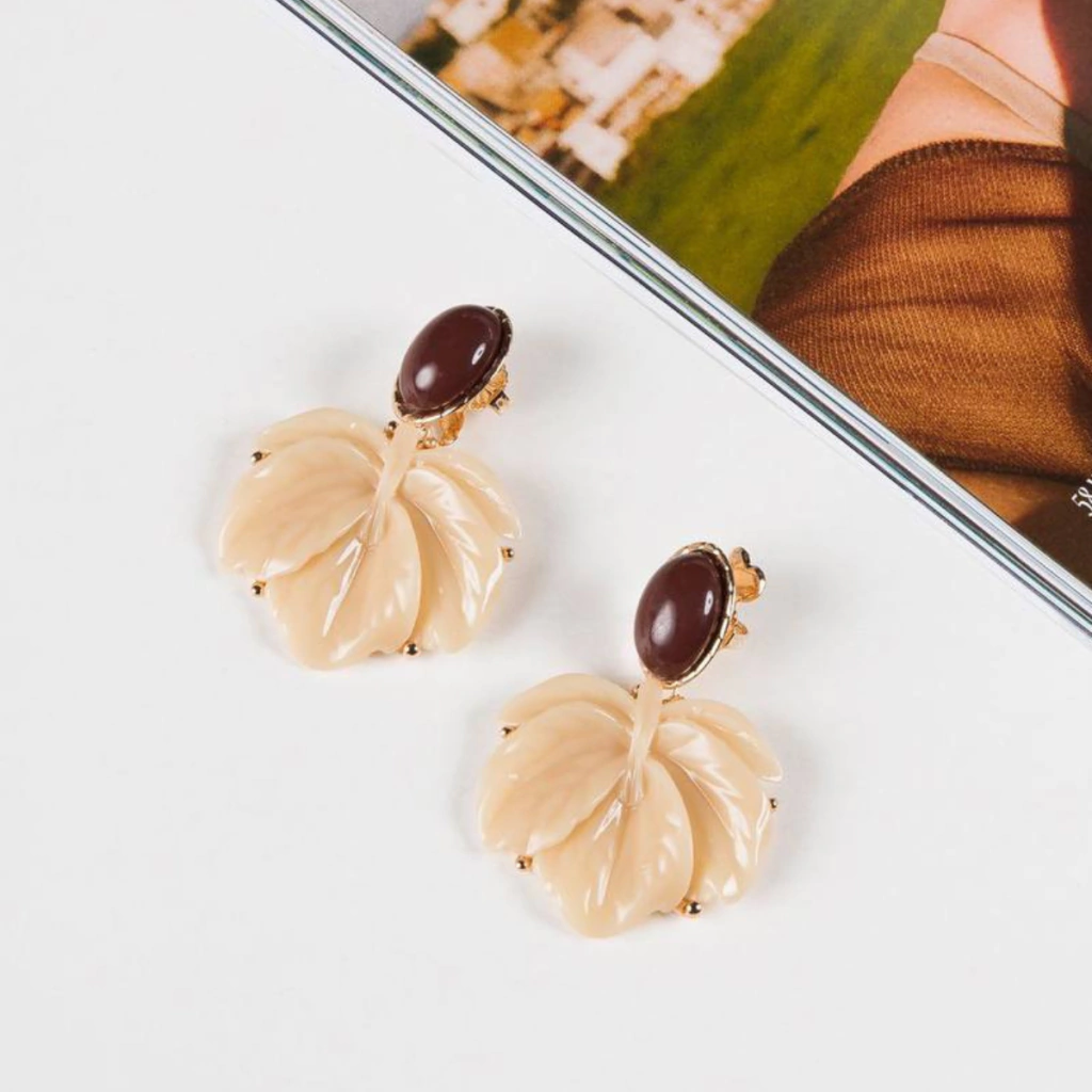 Brinco trabalhado resinas e flor off white banhado a ouro.