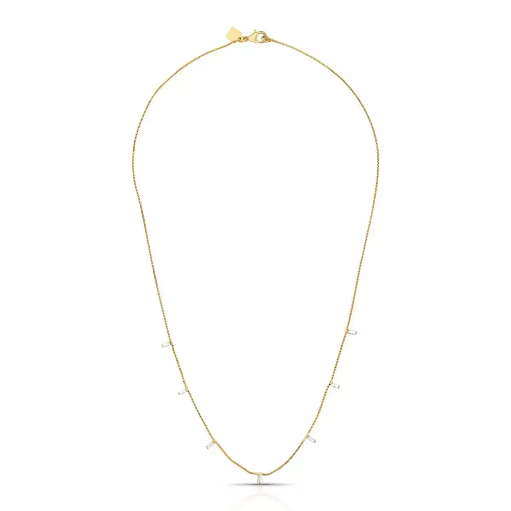 Colar banhado a ouro com cristais retangulares baguete dispostos de forma intercalada, trazendo sofisticação e brilho discretos para o visual. Peça delicada e moderna, perfeita para composições elegantes no dia a dia ou ocasiões especiais.
