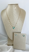 Corrente em malha portuguesa com zircônias brancas dispersas e cristal de coração na cor água marinha, banhados a ouro.