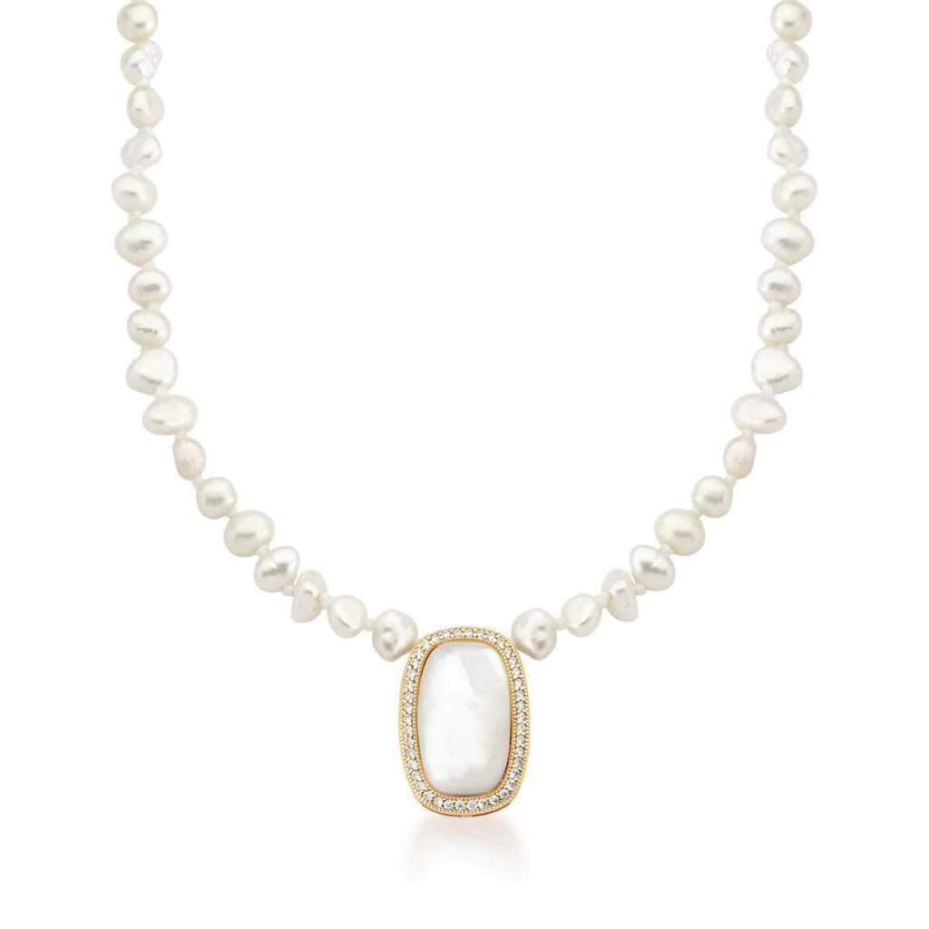 Colar com pérolas de água doce em fio encerado e pingente retangular em madrepérola cravejado com zircônias brancas, banhado a ouro.