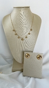 Corrente em malha portuguesa com pingente de sete esferas lisas dispersas banhado a ouro.