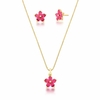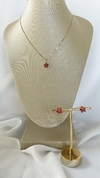 Conjunto com colar em malha veneziana e pingente de flor na cor rubi, e par de brinco de flor na cor rubi banhado a ouro.