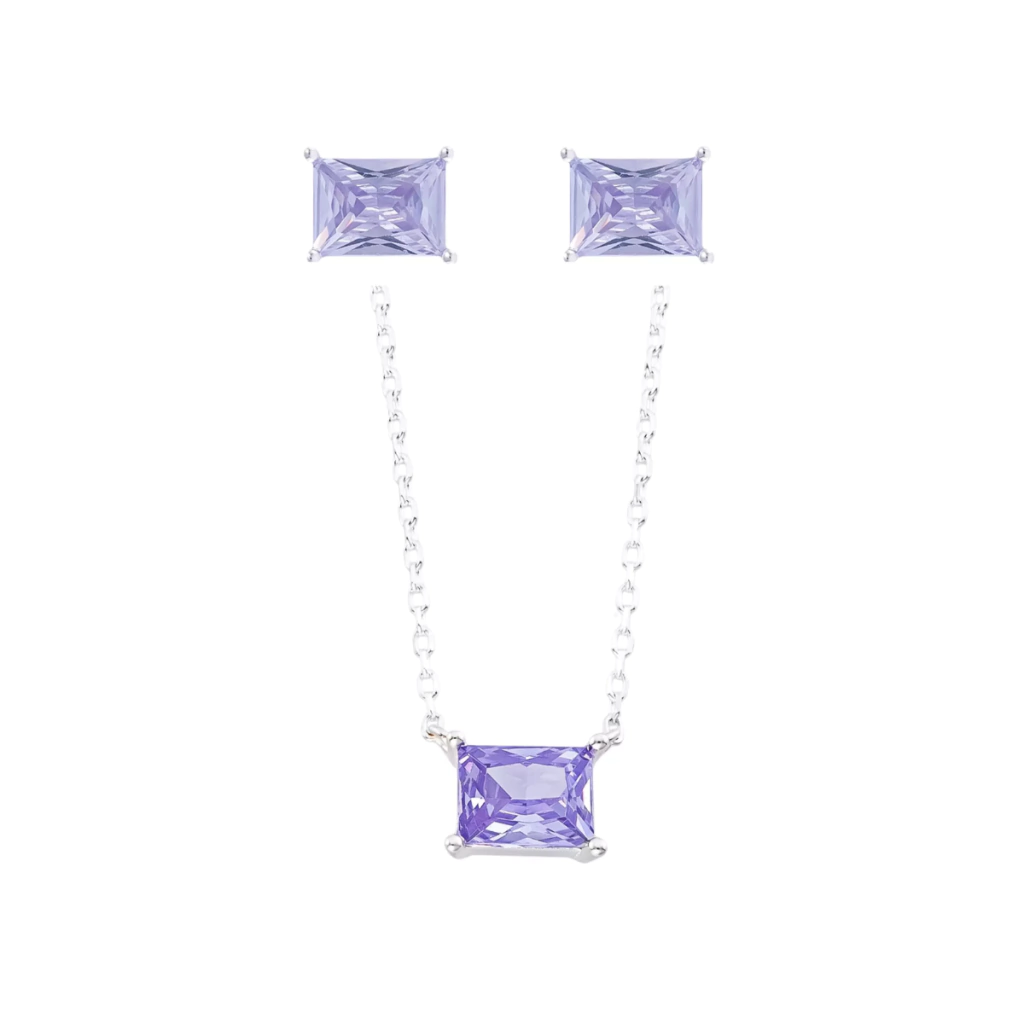 Conjunto, brincos e colar com pingente retangular na zircônia lilás em prata 925 lisa.