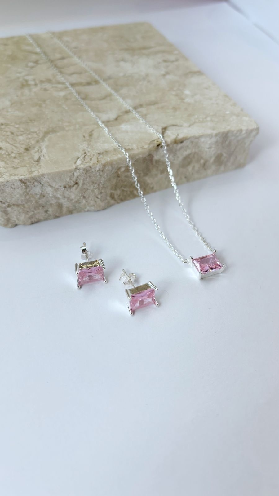 Conjunto, brincos e colar com pingente retangular na zircônia rosa em prata 925 lisa.