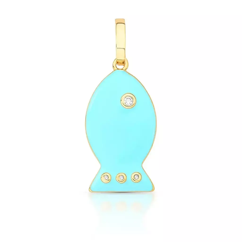 Pingente com fecho de peixe esmaltado com cristal e zircônias banhado a ouro