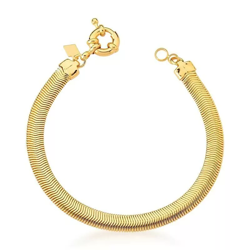 Essa pulseira laminada lisa banhada a ouro, com fecho boia é um acessório perfeito para complementar qualquer look, já que traz modernidade e elegância para o visual.