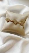 Pulseira groumet com três pingentes de corações cravejados com zircônias brancas banhada a ouro.